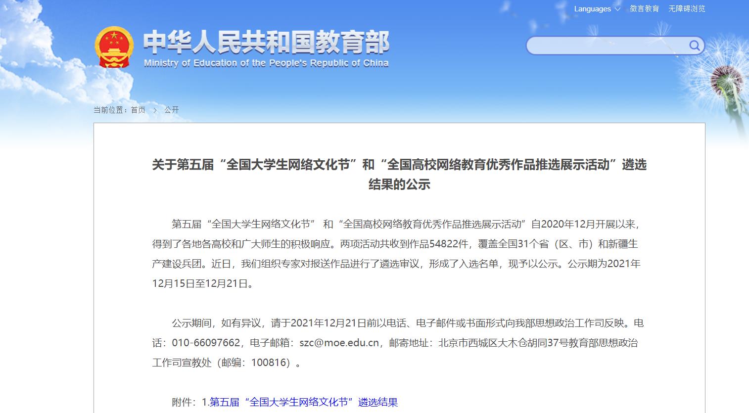 第五届“全国大学生网络文化节”和“全国高校网络教育优秀作品推选展示活动”以“学习‘四史’践使命,传播青春正能量,争做校园好网民”为主题,面向全国高校师生征集微视频、微电影、动漫、网络文章、公益广告、音频、校园歌曲、工作案例、微课和新媒体作品。两项活动共收到作品54822件,覆盖全国31个省(区、市)和新疆生产建设兵团。