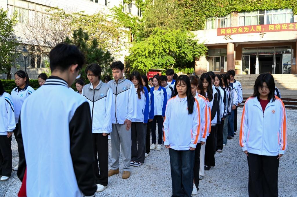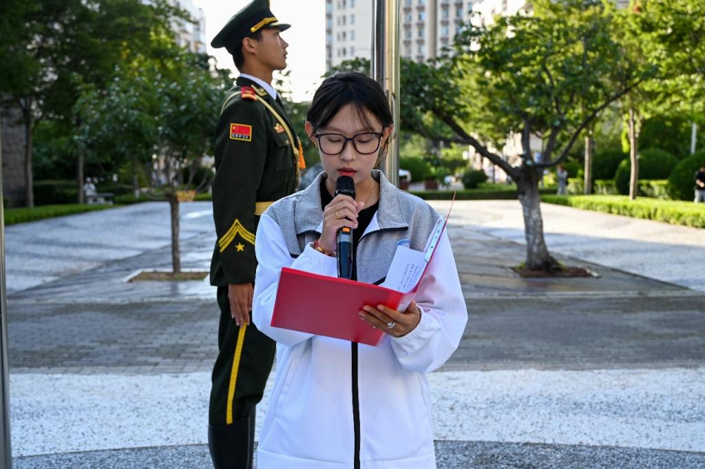 升旗仪式后,在主持人的引导下,大家共同回顾了94年前“九一八”事变的历史背景,全体人员低头默哀1分钟,向战火中逝去的先辈表达深切的追思。默哀结束后,学生代表刘素菡以“红旗展处怀918,警钟鸣时励初心”为题发表演讲。她深情回顾了“九一八”事变后东北沦陷的屈辱历史,动情讲述了杨靖宇、赵一曼等革命先烈及无数无名英雄为民族大义挺身而出的牺牲与赤诚。她向在场同学发出呼吁:“铭记‘九一八’,不是为了延续仇恨,而是以史为鉴、警惕懈怠;缅怀先烈,不是沉溺过去,而是汲取力量、守护并建设祖国,让青春理想与民族复兴的中国梦同频共振。”