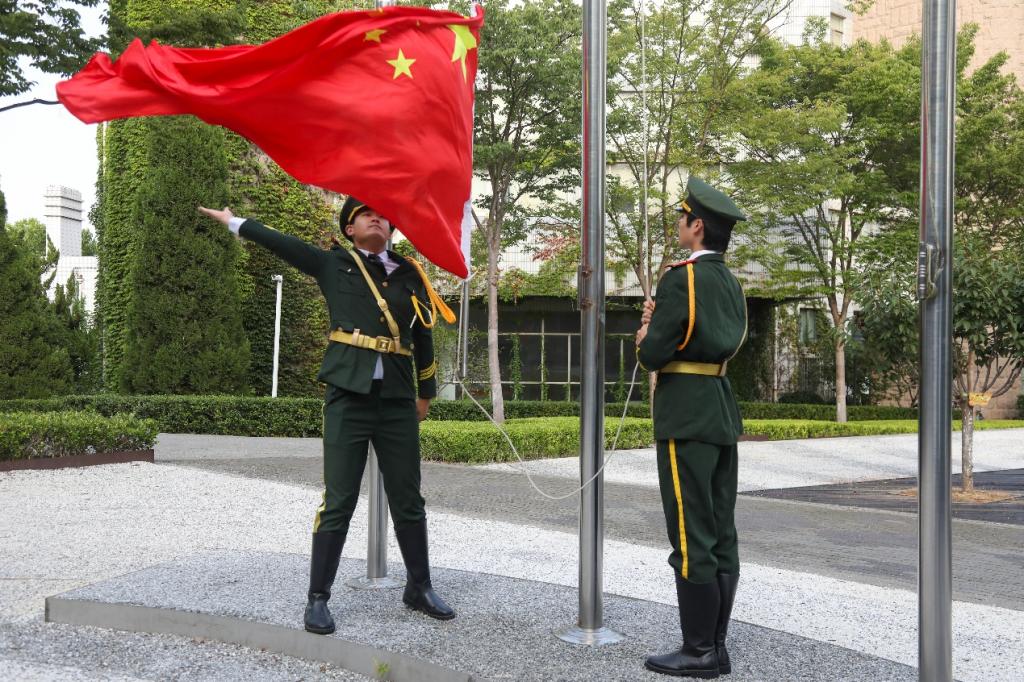 仪式伊始,国旗护卫队队员迈着铿锵有力的正步,昂首挺胸护送国旗走向升旗台。当雄壮激昂的《义勇军进行曲》奏响,五星红旗迎着晨光缓缓升起,全体在场人员肃立行注目礼,目光追随着国旗,以最庄重的姿态传递对祖国的无限崇敬,抒发对历史的深切缅怀。