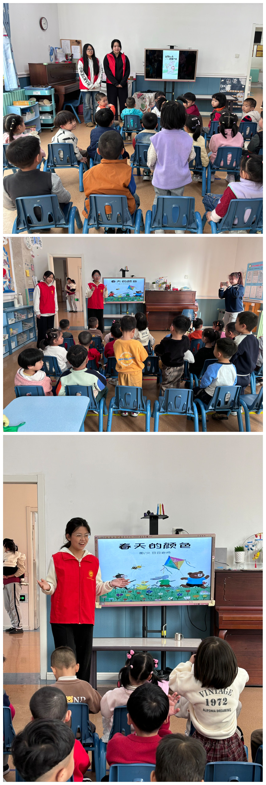 3月26日下午,志愿者们走进幼儿园,为小朋友们带来了一场生动有趣的绘本阅读公益课堂。本次活动以《春天的颜色》和《主动一点,勇敢一点》为主题。志愿者们用活泼的语言引导孩子们观察绘本中的春日景象,鼓励他们在生活中主动表达、勇敢尝试。课堂上,小朋友们坐姿端正、眼神专注,积极回应志愿者的提问,整个教室充满了欢声笑语与求知的热情。志愿者们用耐心与爱心,让绘本故事变得更加鲜活有趣,让孩子们在轻松的氛围中收获知识与快乐。